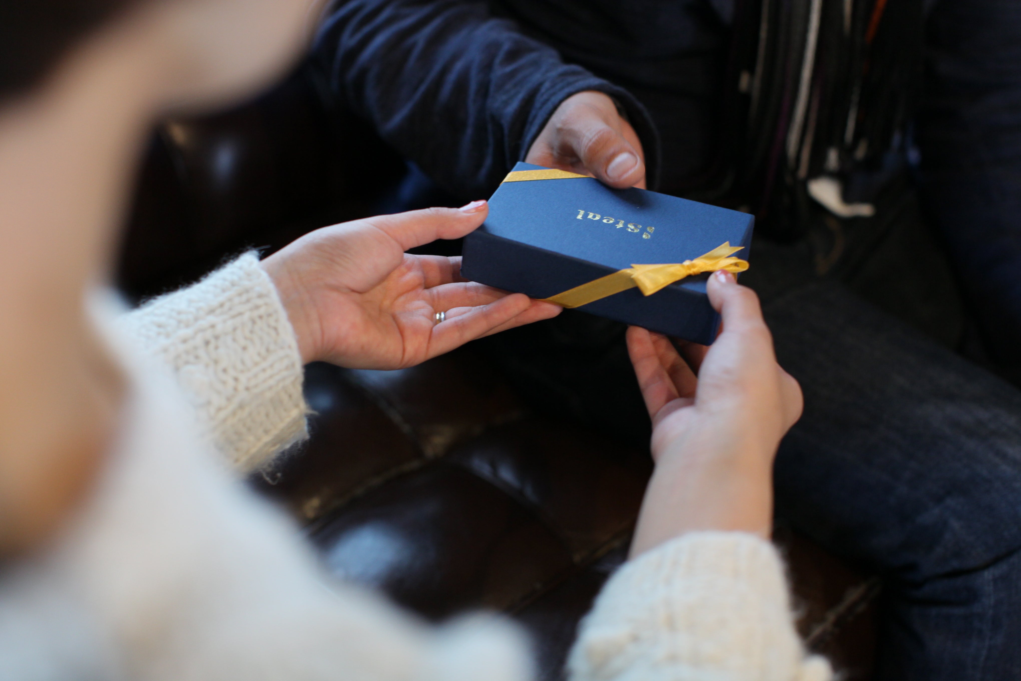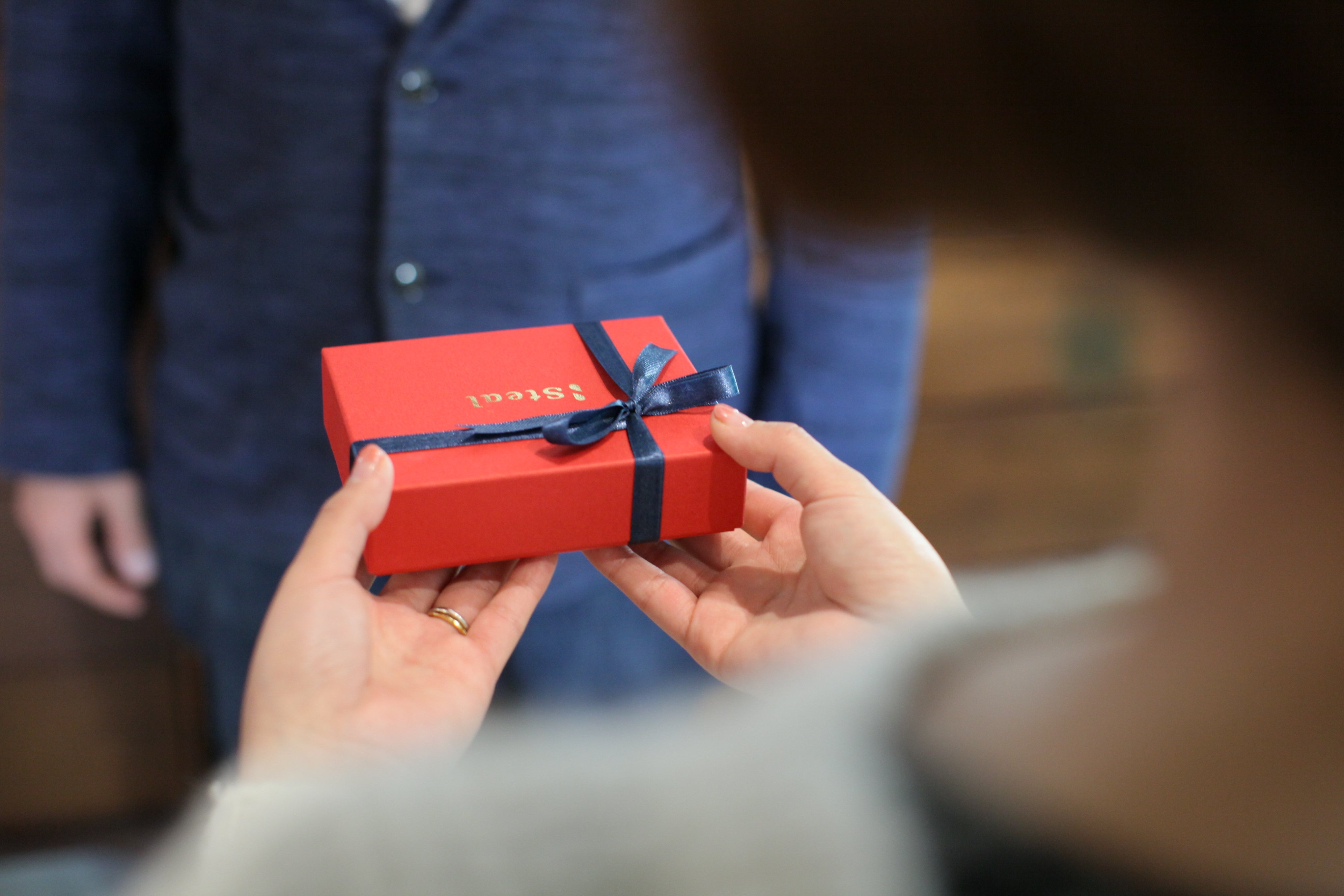 贈られた方が包装を見た段階でも喜んでいただけるように、オリジナルのギフト専用ボックスをご用意しています。ギフトボックス ¥550-商品に合わせたサイズをスタッフが選びラッピングいたします。